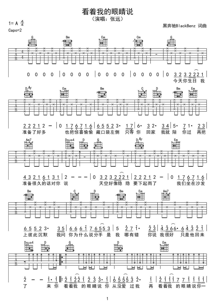 看着我的眼睛说吉他谱,歌曲原调为A调,此版本的曲谱来源于@网络转载,为4/4拍的节奏,按G调指法编配,共3张高清吉他谱,变调夹2品为原歌曲的调式,演唱时可按个人音域选……
