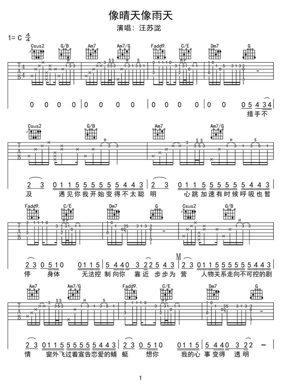 像晴天像雨天吉他谱,歌曲原调为C调,此版本的曲谱来源于@网络转载,为4/4拍的节奏,按C调指法编配,共3张高清吉他谱,变调夹不夹为原歌曲的调式,演唱时可按个人音域选……
