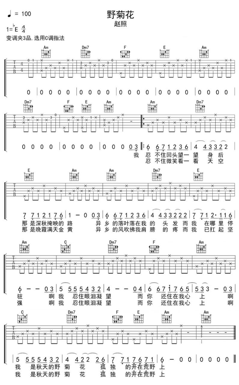 野菊花吉他谱,歌曲原调为降E调,此版本的曲谱来源于@网络转载,为4/4拍的节奏,按C调指法编配,共1张高清吉他谱,变调夹3品为原歌曲的调式,演唱时可按个人音域选择合适……